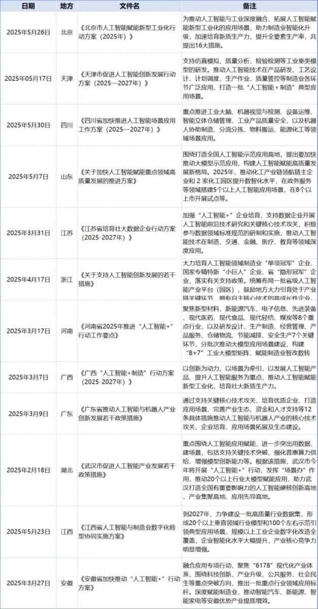 從地方政策來(lái)看,自從2025年《政府工作報(bào)告》中提出要持續(xù)推進(jìn)“人工智能+”行動(dòng)之后,各地政府紛紛結(jié)合自身產(chǎn)業(yè)特色,出臺(tái)人工智能專(zhuān)項(xiàng)政策,已有北京、天津、四川、山東、江蘇、浙江、河南、廣西、廣東、安徽等省市出臺(tái)了人工智能專(zhuān)項(xiàng)行動(dòng),并針對(duì)制造業(yè)領(lǐng)域有相應(yīng)的規(guī)劃,如表1所示。