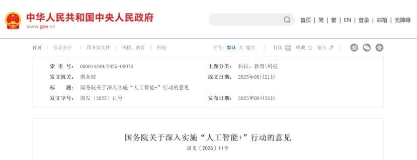 2025年8月26日,國(guó)務(wù)院印發(fā)《關(guān)于深入實(shí)施“人工智能+”行動(dòng)的意見(jiàn)》,要求以科學(xué)技術(shù)、產(chǎn)業(yè)發(fā)展、消費(fèi)提質(zhì)、民生福祉、治理能力、全球合作等領(lǐng)域?yàn)橹攸c(diǎn)深入實(shí)施“人工智能+”行動(dòng)。