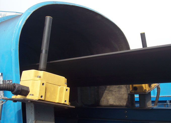 防偏開關(guān)通常安裝在距輸送機(jī)頭部或尾部0.3-2m的地方,通常在輸送機(jī)兩側(cè)成對安裝,可固定在輸送機(jī)縱梁的頂部或底部,動作桿距皮帶邊緣距離約25~75mm。