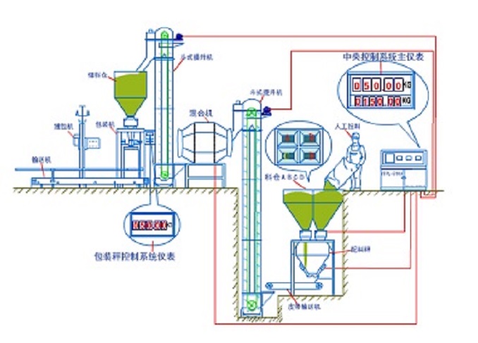 該套生產(chǎn)線廣泛應(yīng)用于各類物料多行業(yè)的自動(dòng)配料包裝生產(chǎn)線,配料只需人工將2種以上10種以下的物料投入各料倉(cāng)中,電腦控制系統(tǒng)自動(dòng)將各種物料按預(yù)先設(shè)定好的比例自動(dòng)投放到稱重系統(tǒng)中,稱重系統(tǒng)將 按照每種物料的配料比例自動(dòng)加入,每一次配料完成后由斗式提升機(jī)自動(dòng)將物料提到混合機(jī)中進(jìn)行混和,混合均勻后自動(dòng)排出再由斗式提升機(jī)提到儲(chǔ)料倉(cāng)中供給包裝 系統(tǒng)進(jìn)行自動(dòng)定量包裝。
