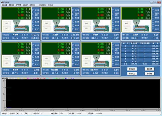 賽摩配料控制系統(tǒng)主要由稱重給料機(jī)、電氣控制系統(tǒng)和計(jì)算機(jī)管理系統(tǒng)三部分組成。該系統(tǒng)采用通用的工業(yè)計(jì)算機(jī)人機(jī)交互界面形式,它具有數(shù)據(jù)采集、控制、報(bào)警、圖形和數(shù)據(jù)顯示等功能。根據(jù)設(shè)定要求完成物料的配比控制以及生產(chǎn)過(guò)程中各種數(shù)據(jù)管理。