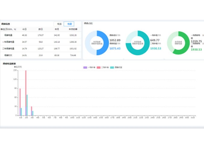 調(diào)峰收益報(bào)表:包括日?qǐng)?bào)表、月報(bào)表、年報(bào)表及實(shí)時(shí)調(diào)峰數(shù)據(jù)報(bào)表,將調(diào)峰收益以報(bào)表及曲線的形式展示出來(lái),避免了人工統(tǒng)計(jì)容易出錯(cuò)的問題。